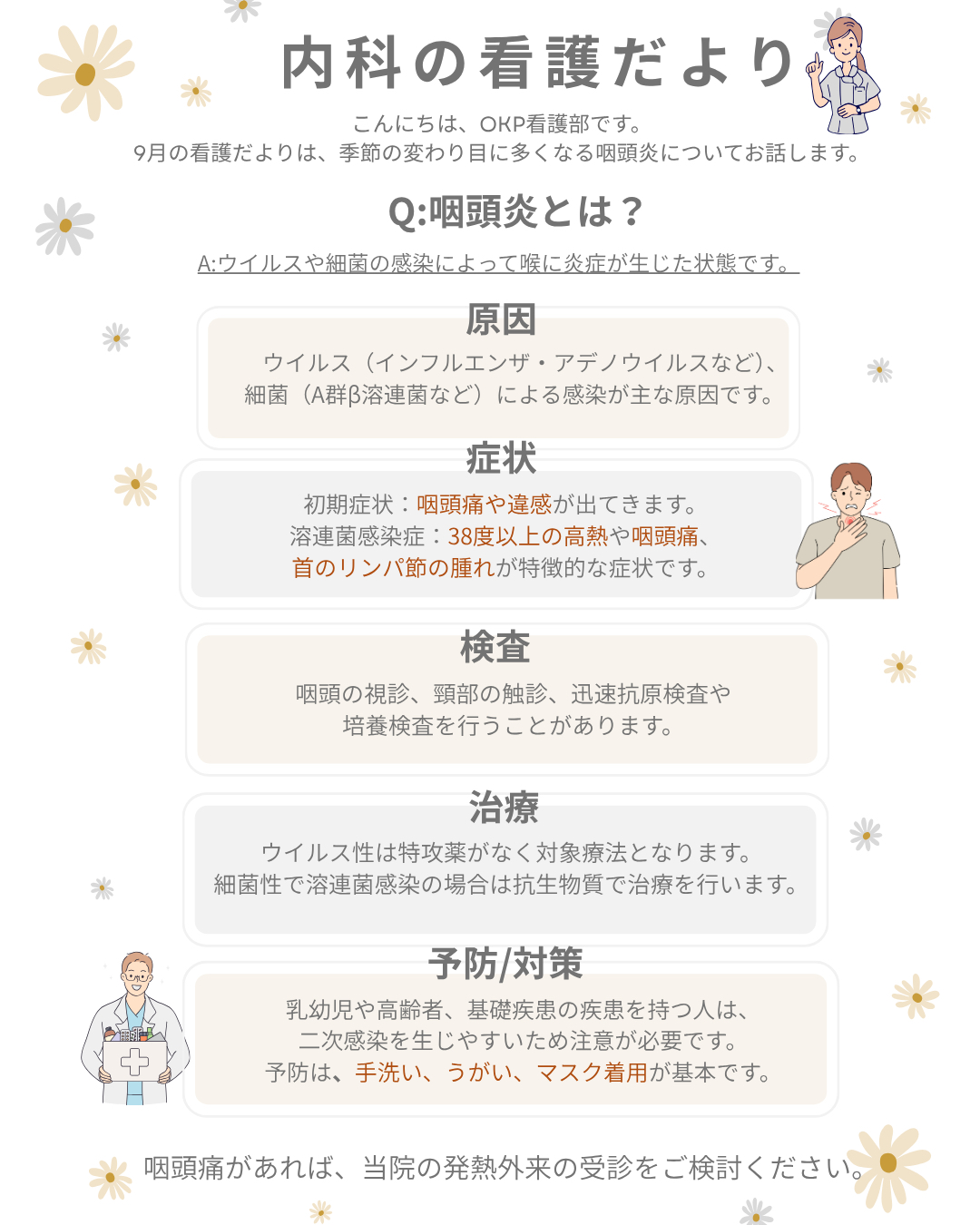 こんにちは、OKP看護部です。👩⚕️🩺今回は季節の変わり目に多い咽頭炎についてお話します。咽頭炎疑いの場合は、ぜひ当院内科受診をご検討ください。