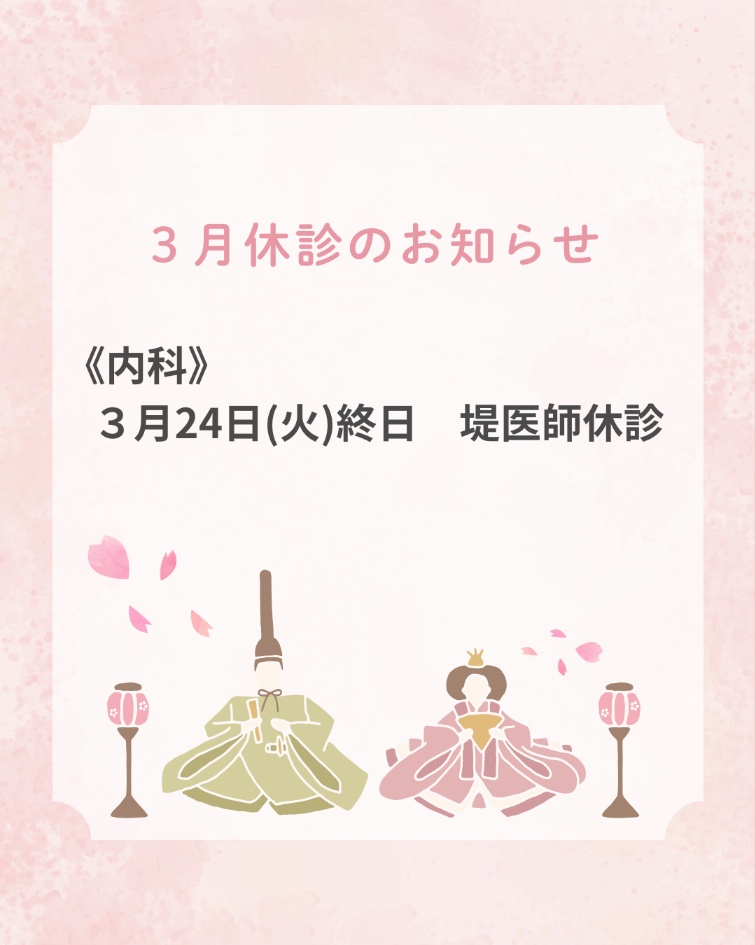 3月24日(火)終日 堤医師 休診