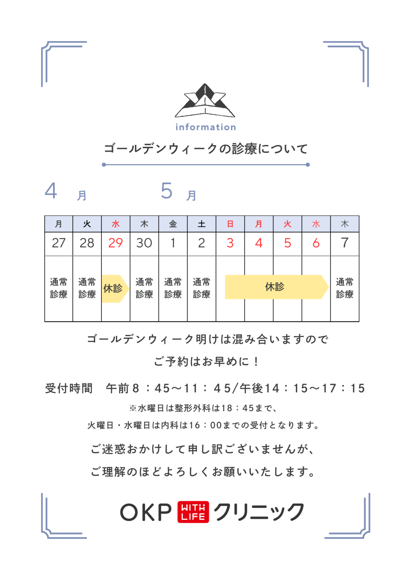 休診情報 2026.04.20 ゴールデンウィークの診療案内